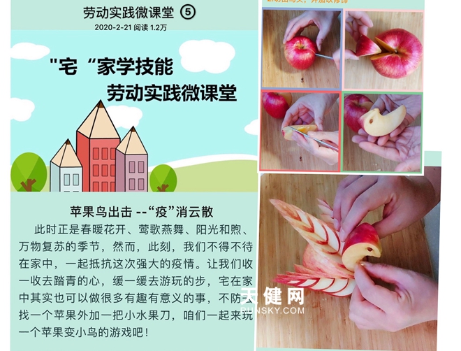 天健网消息(大连新闻传媒集团记者 金东淑)今天,甘井子区汇文中学王楚瑶的家里支起了平板电脑,餐桌上摆满了各色水果和果盘、水果刀。王楚瑶正通过平板电脑在“劳动实践微课堂”上跟随着老师,认真地做着水果雕刻。爸爸妈妈也被吸引过来,跃跃欲试。