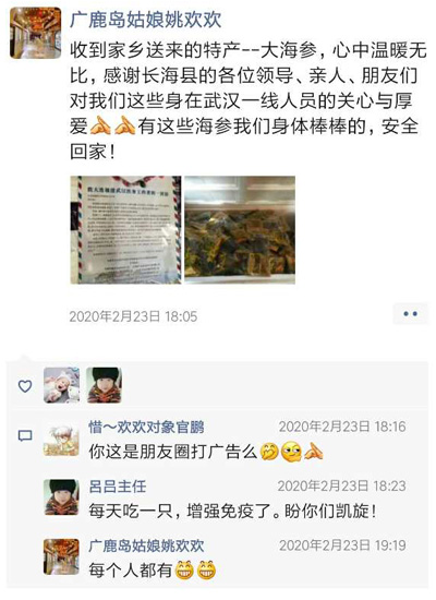 在武汉的长海籍医护人员已经收到长海县海参