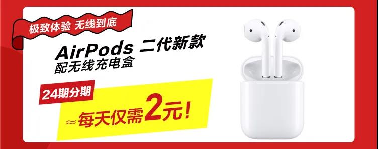 AirPods 二代新款,配无线充电盒,24期分期,每天仅需2元。还有iphone11 128G,华为Mate 30Pro(5G)8GB+256GB、科沃斯 扫地机器人、布鲁雅尔空气净化器、苏宁极物小Biu10公斤争气洗烘一体机、海尔458升无霜变频智能多门冰箱、美的1.5匹1级变频空调、小米 4K超高清智能语音电视、芝华仕头等舱简约布艺功能沙发、西门子13套独立式立嵌两用自动洗碗器……