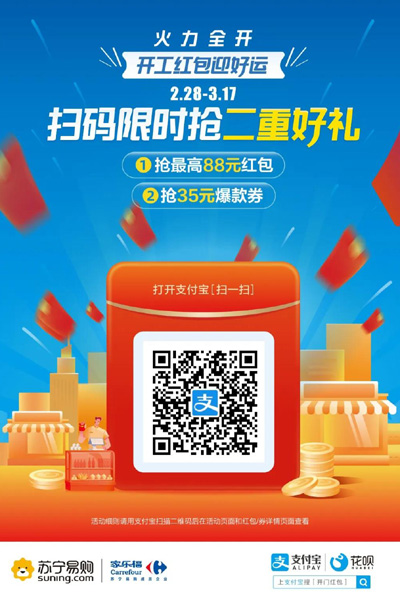 2.28-3.17,火力全开开工红包迎好运,扫码限时抢二重好礼。1.抢红包,金额随机,2.领商品优惠券,享福利。