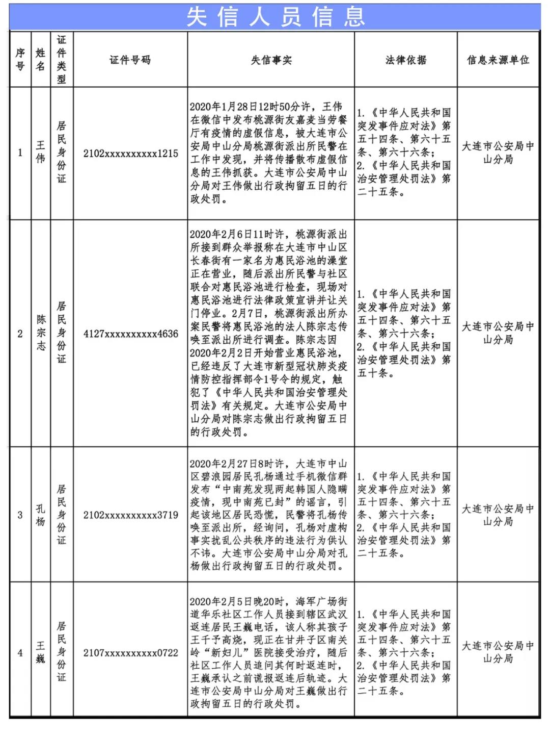 根据《大连市人民代表大会常务委员会关于依法做好新型冠状病毒肺炎疫情防控工作的决定》《大连市新型冠状病毒感染的肺炎疫情防控指挥部令》《大连市公检法司疫情防控联合通报》《关于在全市建立疫情防控失信黑名单的通知》(大疫指办发〔2020〕56号)及相关法律法规之规定,现将近期大连市疫情防控期间失信人员相关情况公布如下: