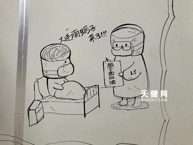 医护人员也是有压力的,怎么能够释放他们的压力?我们有一个走廊的涂鸦文化,一些年轻的九零后九五后的小医生小护士很有活力,不乏有才华的。有个护士叫刘玉,她下班后就在一个冰冷的清洁区的走廊画一些她想释放的情感的画,这个画首先是从我们跟病毒的斗争开始,她在这些画中用一些惟妙惟肖的形象,包括大连海蛎子和武汉的热干面的邂逅,联手抗击病毒的这样的形象的展示,大家看到这样的图景的时候压力就小了很多。