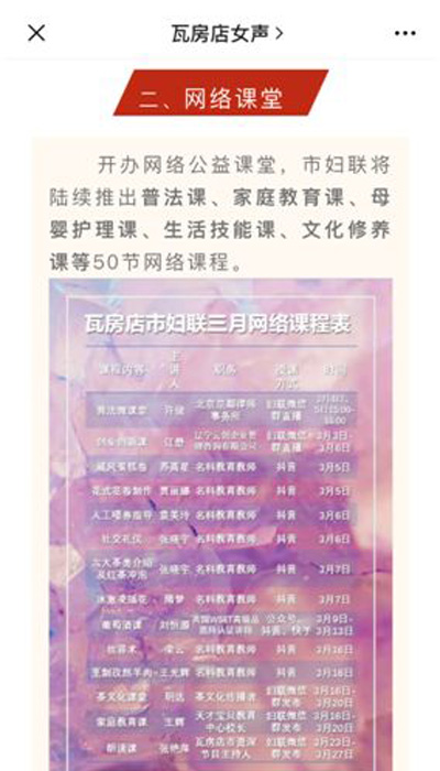 三八节前夕,瓦房店市妇联通过微信公众平台和《今日瓦房店》报发布网络课堂课程表,对活动进行预告。三八节期间,瓦房店市妇联通过微信公众号、抖音、妇联各大微信群等平台采用录播、直播相结合的方式陆续推出包括普法课、家庭教育课、母婴护理课、生活技能课、文化修养课、创业创新课等诸多系列50节网络课程,课程受到妇女群众好评,截至目前有三万人次受益。