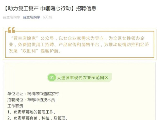 为助力企业在科学做好疫情防控的前提下有序复工复产,大连普兰店区妇联启动安心、贴心、连心、真心“四心”行动,开办防疫安心课堂,走访女性领办的企业,免费提供用工招聘、产品宣传和销售平台,普兰店区妇联推出女性创业公益直播课堂等系列活动,助力复工复产,带领全区广大妇女朋友在科学防疫的同时,立足岗位,担当奉献,为打赢防控疫情阻击战贡献巾帼“她”力量。