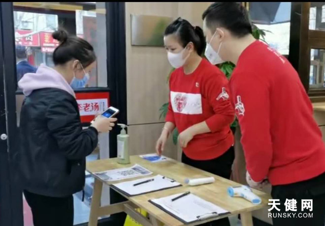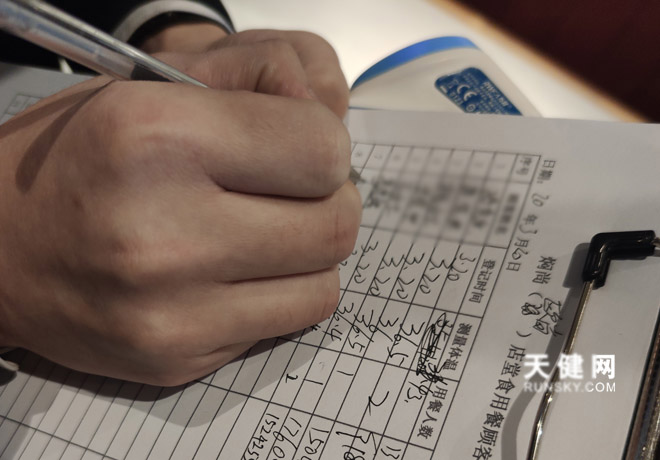3月21日,临近饭点,记者来到位于欧尚广场一家焖面店。在门口张贴一张告示牌,上面写着“本店已消毒,请佩戴口罩入内”。进入店内,服务员向记者索要健康码,在记者出示健康码后,服务员引导记者来到一个相对独立的就餐区域坐下。随后,服务员给记者进行测温,同时将测温情况记录在案,并登记记者的姓名和联系方式。点餐结束后,服务人员告知记者洗手台的位置,并提醒记者就餐前请洗手。