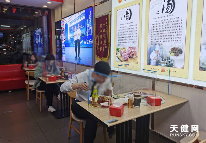22日晚上6:40,正是上客时间。位于北京街的李老汤拉面馆有四五桌客人就餐,记者发现,每张桌子上安装一个亚格力材质的隔离罩,可有效保护食物的安全。进店后,员工向记者索要健康码并测温。