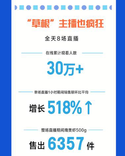 在3月27日“家乐福5折到家日”期间,家乐福在苏宁易购APP直播间连开8场直播,在线观看人数超过30万人,有效带动即时销售。据家乐福官方数据显示,直播期间的销量环比前一小时增长超过518%,而南美虾500克成为当天顾客购物车的最火爆商品,售出6357件。