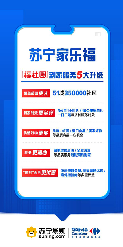 3月12日,家乐福宣布重磅推出“福社圈”到家服务升级计划——通过3公里1小时达、10公里半日达、最高一日三送等多种服务时效,生鲜进口品、红酒等丰富商品及清洗、维修、家政等社区服务,为35万个“福社区”提供多重幸福权益,实现心愿必达。