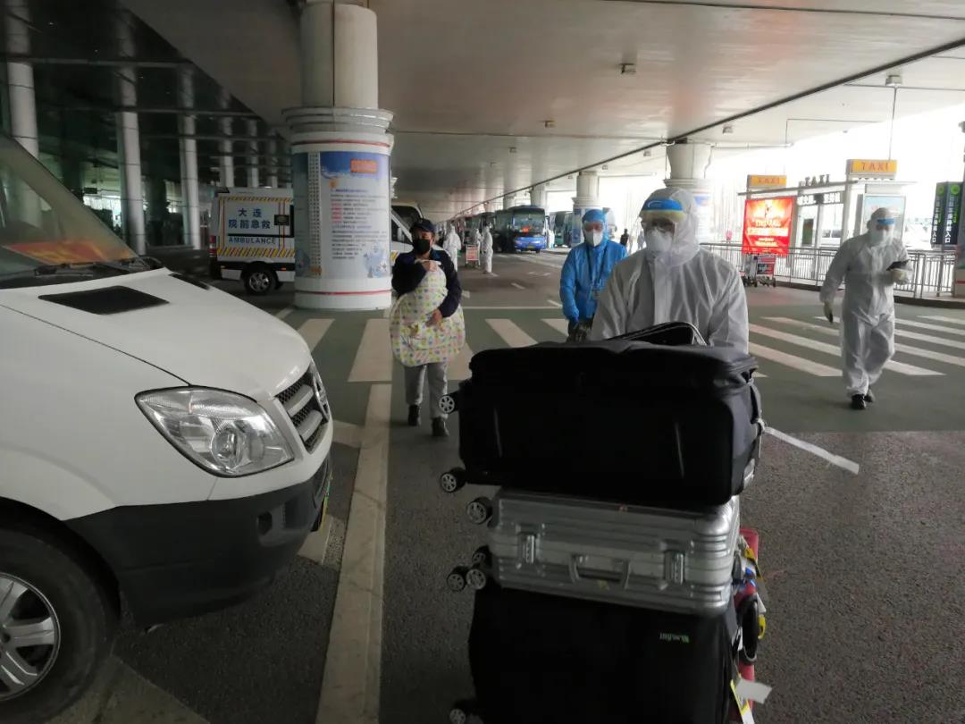 “您好,请您上一号车,行李我帮您放好”、“您先扶大娘上车吧,我帮您把轮椅抬上去”、“小朋友,自己坐飞机回国害怕吗?马上就要到家了开心吗”……在亲切的关怀与温暖的交谈中,境外返连人员回到了祖国家乡,而负责迎接他们的正是大连甘井子区机场疫情防控机动队的队员们,他们每天都要穿戴防护服、护目镜、口罩和一次性手套,在机场航站楼外奋战12个小时以上,完成护送境外返连人员回家的任务。