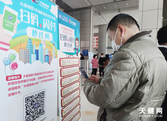 在地铁3号线大连站,记者下载“大连地铁e出行”APP,打开后点击【我的】,选择【支付管理】点击【银行卡】,完成银行卡绑定,点击APP页面下方【乘车码】,获得乘车二维码,将显示的乘车二维码,放在闸机二维码扫描区进行扫描,闸机屏幕显示扫码成功后即可过闸,全程仅需30多秒,十分便捷。