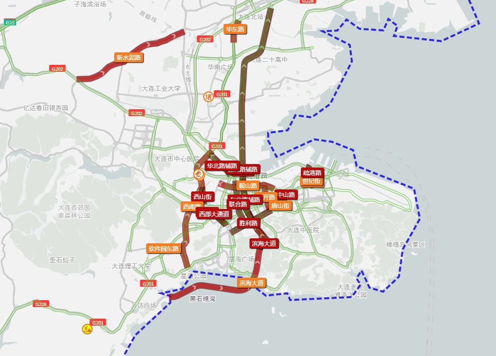 部分商圈、景点周边通行压力大:预计节日期间各旅游景点车流人流不会达到爆满状态,但滨海路、星海广场等临近海边的道路广场周边由于停车泊位不足,通行秩序会一定程度受阻。另外,随着假期购物需求增多,青泥洼、西安路、华南广场等大型商圈,周边道路通行压力将有所增大。