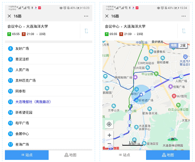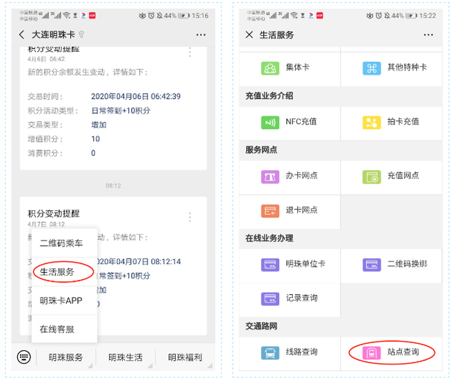 1.进入“大连明珠卡”微信公众平台,点击“明珠服务”→“生活服务”→选择“站点查询”。