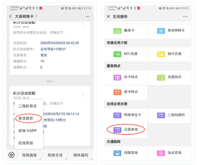 1.进入“大连明珠卡”微信公众平台,点击“明珠服务”→“生活服务”→选择“记录查询”。
