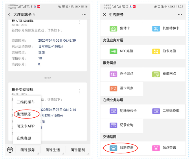 1.进入“大连明珠卡”微信公众平台,点击“明珠服务”→“生活服务”→选择“线路查询”。