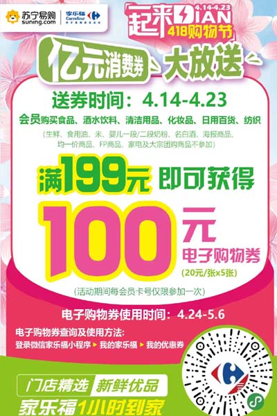 天健网消息(曲静媛 记者 葛春家)春暖花开,天气好好,太阳晒得我暖暖滴!打扮一下,出门逛逛,买点好吃滴,集美们,看这里!万众瞩目的418购物节来啦!家乐福亿元购物券大派送~放心来,安心购,不仅消费有优惠,消费完还有购物券返,时长达大半月,买买买的理由,一个就够了。