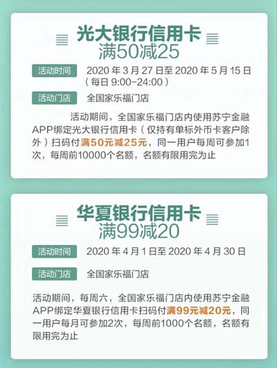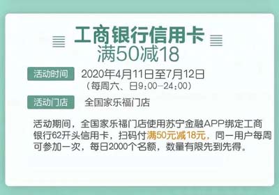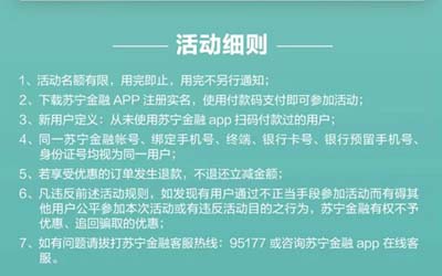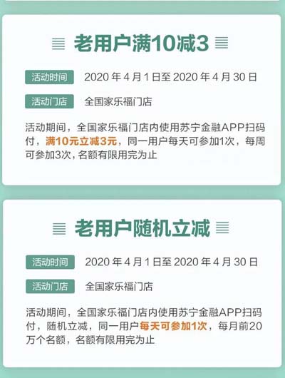 新用户满30减15,活动时间:2020年4月1日至2020年4月30日;活动门店;全国家乐福门店;全国家乐福门店内使用苏宁金融APP扫码付,新用户满30元立减15元,同一用户限参加一次,名额有限用完为止。