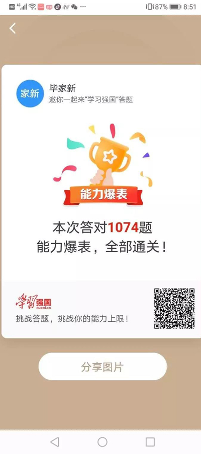 “本次答对1074题,能力爆表,全部通关!”