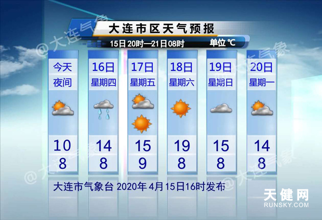 周五上午降雨将逐渐结束,陆地北风5到6级夜间减弱到4到5级,气温方面变化不大,市区全天在9~15℃。预计周六天气将短暂转晴,风力不大,市区最高气温19℃,最低气温8℃。虽然白天温暖舒适,但早晚温差较大,市民朋友要及时增减衣物。周日-下周一,大连地区云量将再次增多,气温回落,届时市区最高气温在14~15℃。