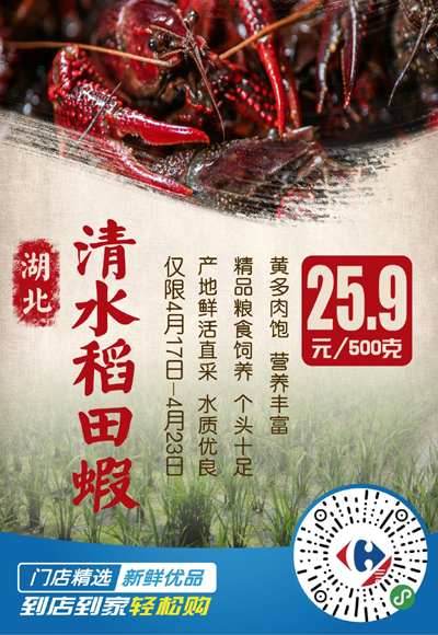 15号开始捕捞的这批湖北“清水稻田虾”将于16号完成分拣装车,发往家乐福全国各地大仓,17号,家乐福位于北京,上海、哈尔滨,长沙,成都,昆明,广州,深圳等地的155家门店鲜活开售,恰逢家乐福418购物节,尝鲜价低到25.9元/500克(仅限4月17日至23日)。同时,顾客还可以通过家乐福小程序、苏宁易购app、苏宁小店App、及美团、饿了么下单,享受1小时送到家的极致“鲜“体验。