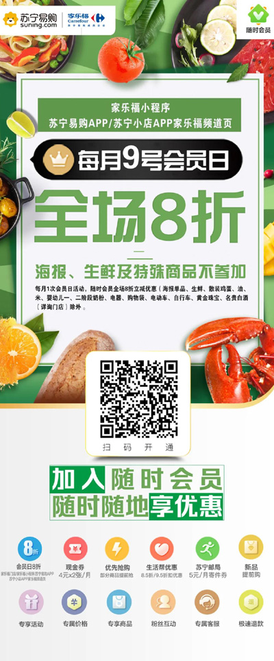 会员日:家乐福每月9日可享一次全场八折优惠(线上专享,部分商品除外);苏宁小店每月一次第二件半价;红孩子会员商品折扣,99-20满减券;