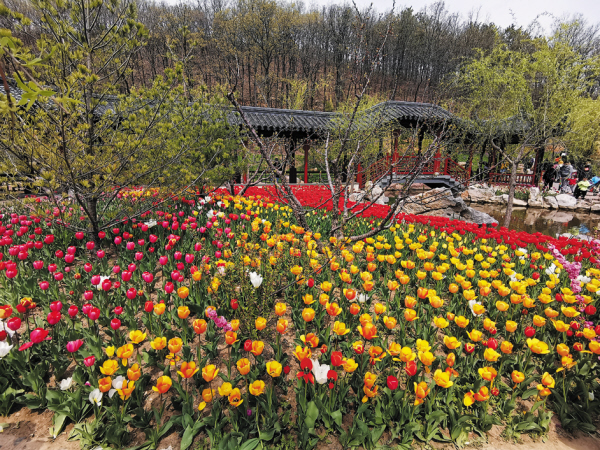 同时,景区引进4万余株郁金香,正是盛花期,游客到这里可以欣赏樱花、郁金香、梅花、连翘等8种花。