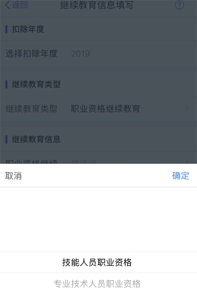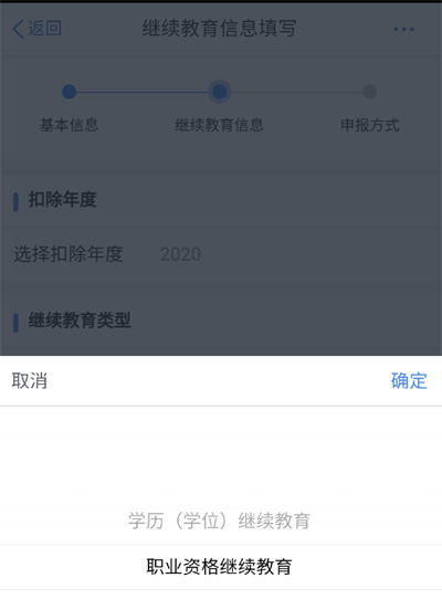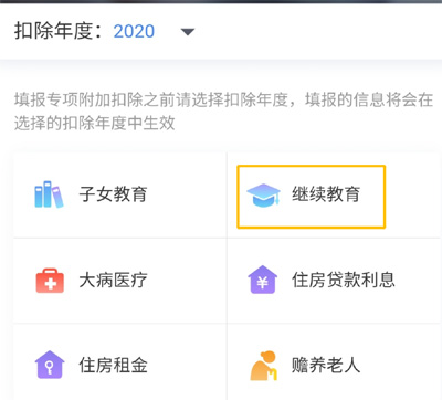 1.打开个税APP,点击【首页】-【专项附加扣除填报】-选择【扣除年度】-点击【继续教育】。