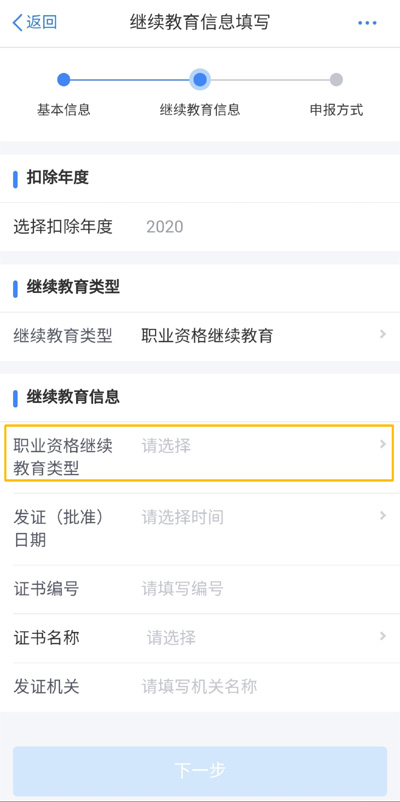2.根据实际情况,选择“继续教育类型”,填报“继续教育信息”。