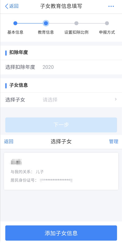 2.进入子女教育填写界面后,选择需要申报的子女信息,选中子女信息。若需要增加受教育子女信息,点击【添加子女信息】即可。