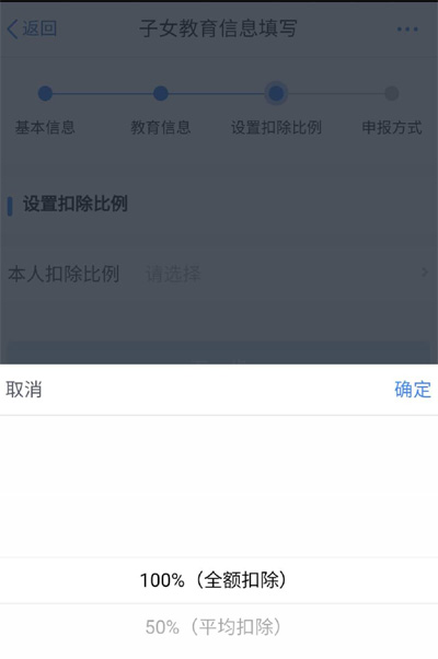4.设置扣除比例。按实际情况选择其一,选择100%(全额扣除)是全部由自己扣除,选择50%(平均扣除)是自己和配偶分别扣除50%。