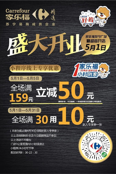 家乐福精选店本次开业,苏宁旗下红孩子,家乐福,苏宁易购联动,为新客发放价值60元的新客大礼包,内含10元家乐福线上专享券(新人专享)10元红孩子现金抵用券40元的苏宁易购现金抵用券。