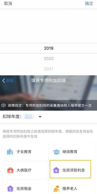 1.打开个税APP,点击【首页】-【我要办税】-【专项附加扣除填报】-选择【扣除年度】-点击【住房贷款利息】。