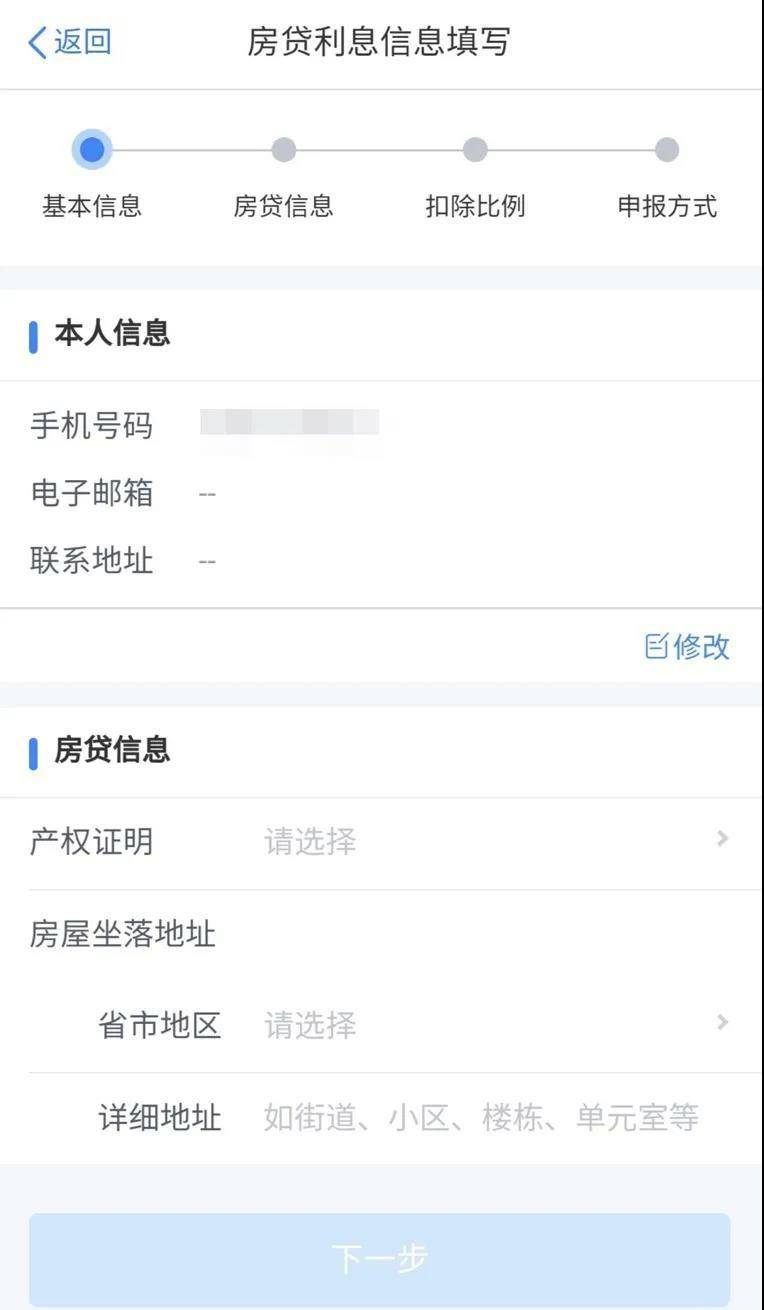 2.确认本人信息,填写房贷信息,填写后点击【下一步】。