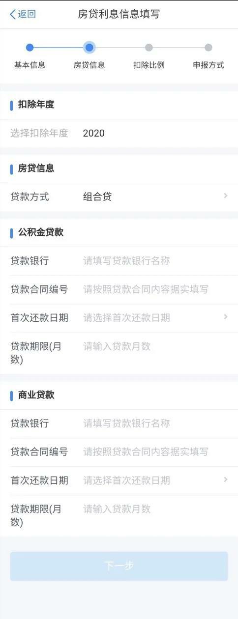 4.如果选择【组合贷】,需要分别填写【公积金贷款】及【商业贷款】相关信息。如果选择【商业贷款】或【公积金贷款】,只需要填写商业贷款或公积金贷款相关信息,填写之后点击【下一步】。