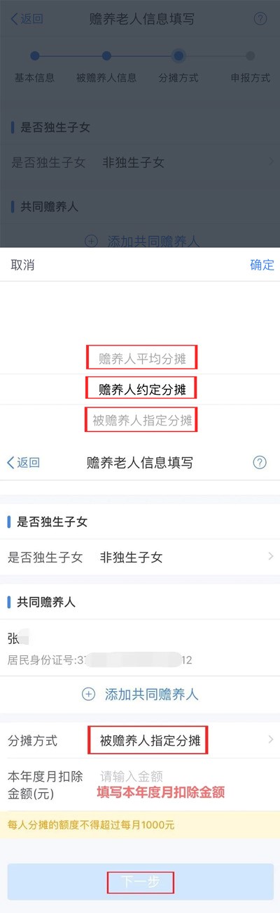 ①根据实际情况选择分摊方式。若为“独生子女”,则分配比例自动为“全部由我扣除”。