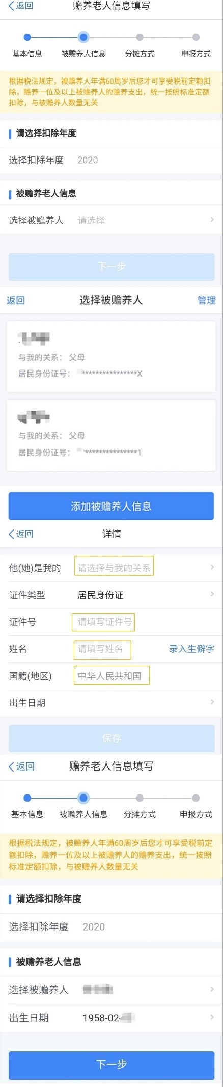 选择扣除年度及被赡养人。已经采集信息可以直接选择,若没有信息,可以点击“添加被赡养人”进行信息采集。选择后,被赡养人信息直接带到界面中,点击‘下一步’。