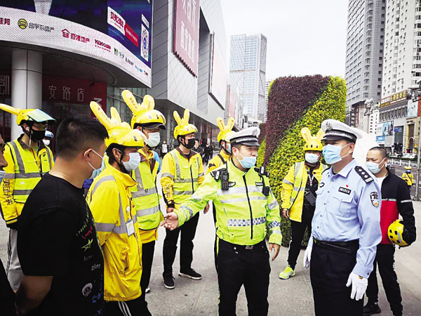 交警与外卖小哥们共同扶起护栏的暖心举动,也被热心市民拍摄成视频在网络上热传。