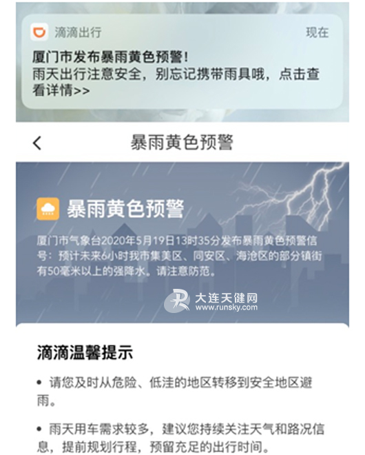 5月19日滴滴向厦门乘客推送暴雨黄色预警信息