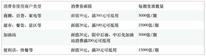 4.单用户在每个投放周期内可领取并使用各面值消费券1张,每期活动各面值消费券数量有限,先领先得,领完即止。其中50元消费券每期发放5000张;20元消费券每期发放30000张(其中20元消费券25000张,20元加油专属消费券5000张,每期每用户限选择1张领取);10元消费券每期发放15000张。