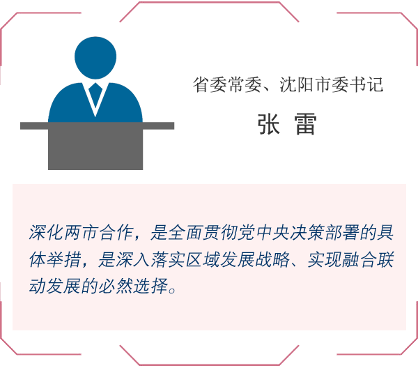 张雷说,深化两市合作交流,我们要切实把思想和行动统一到党中央决策部署特别是习近平总书记关于东北、辽宁振兴发展的重要讲话和指示批示精神上来,统一到省委工作要求上来,进一步增强深化合作的高度自觉。要认真学习大连市在产业结构调整、县域经济发展、扩大对外开放、提升城市品质等方面的好经验好做法,不断把沈阳各项工作提高到新水平。要聚焦合作重点任务,坚持工程化、项目化实施,努力在共同打造物流通道、促进产业发展、推动科技创新、搭建开放平台等方面取得更大突破。要进一步建立健全组织领导机制、互惠互利机制、民间交往机制,推动两市合作交流常态化、制度化。