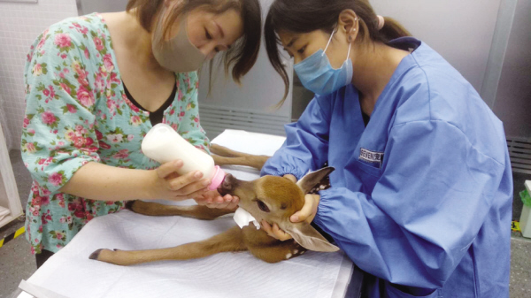 经过现场简单的检查,被救的小鹿没有明显外伤,就是体质非常虚弱,好像刚生下不久,志愿者们马上联系到宠物医院,并送去检查。经过检查,这只小鹿大概出生一两天左右,不知道是什么原因就和母鹿分散了,应该还没有吃上母乳。经过宠物医院医生的努力,小鹿学会了喝奶,也补充了水分,身体逐渐恢复了健康。接下来,如何安置它成了一个棘手的问题。