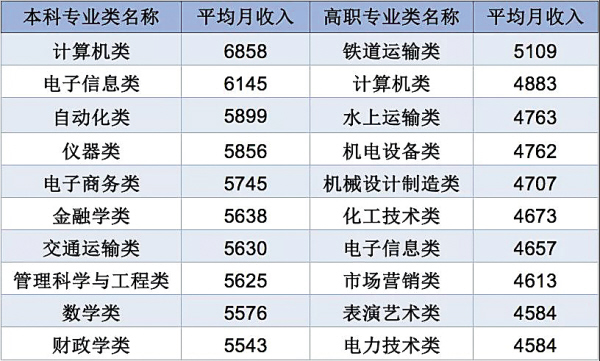 具体来说,计算机类、电子信息类、自动化类等本科专业毕业生薪资较高,2019届平均月收入分别为6858元、6145元、5899元;铁道运输类、计算机类、水上运输类等高职专业毕业生薪资较高,2019届平均月收入分别为5109元、4883元、4763元。
