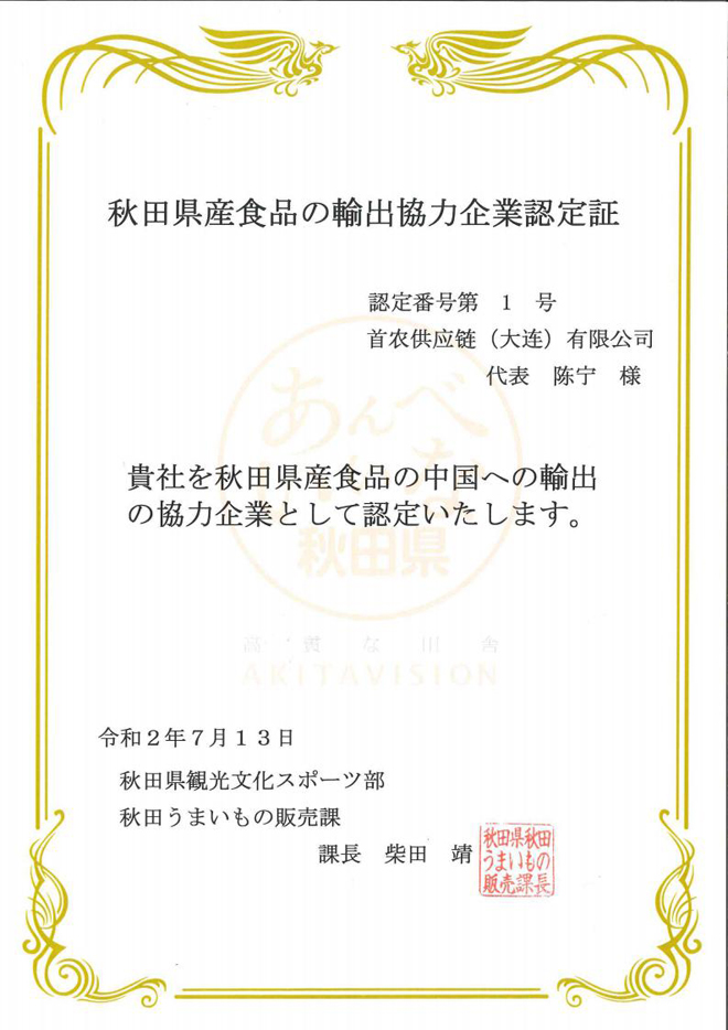 天健网消息(大连新闻传媒集团记者 温笑权)日前,首农供应链(大连)有限公司收到了日本秋田县旅游文化体育部颁发的秋田县食品出口合作企业认定书,正式确定了与该县在产品对华出口及市场推广业务上的合作关系。这是秋田县为扩大当地产品出口首次向外国企业颁发出口合作企业认定书。
