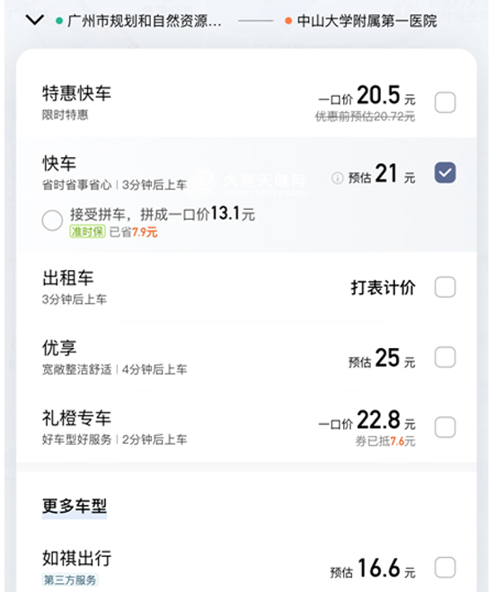 滴滴出行APP6.0版本中,各车型的服务特点、预估价格与预计上车时间、优惠金额等信息被明确标出,让乘客能一目了然地看到当前不同车型的预估车费,方便比价,更快出发。