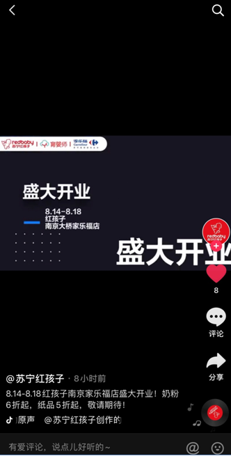 8月11日,苏宁家乐福在官方微博和抖音帐号“拍了拍”苏宁红孩子,“官宣”了红孩子入驻家乐福的重磅消息:14日,红孩子南京大桥家乐福店(地址:南京市鼓楼区大桥南路7号)、无锡永乐家乐福店(地址:无锡市清扬路39号家乐福2楼)将正式开业,开启线下大卖场品类专业化门店的新模式。这个周末,南京、无锡两地的宝妈宝爸多了一个遛娃消暑囤货的好去处。