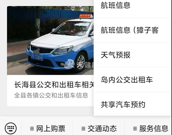 长海智慧交通平台包含大长山鸳鸯港、金蟾港、小长山西沟港、广鹿岛多落母港、獐子沙包港、海洋红石港和皮口港的网上售票功能。 不仅如此,还能提供天气信息、航班信息、交通动态、公交信息和出租车预约等服务。