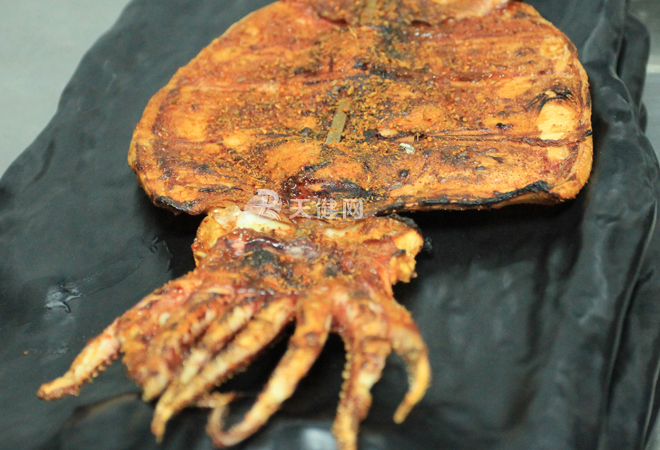 洗净的鱿鱼穿好放在炭火上,为了锁住鱿鱼的水分,刷上薄薄一层油,鱿鱼在炭火上不停地翻烤,烤制两面金黄,冒着油泡,此时,再刷上天津利民的蒜蓉辣酱,那份鱿鱼独有的鲜香四处飘散,令人垂涎三尺,就是这个味才对大连人的胃口。