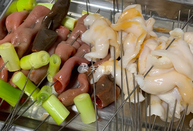 串烤海肠,标配一把小葱段,不仅颜色好看,还可佐味。一厘米的香葱段,五厘米的海肠段,依次按序码齐穿好,放在烧烤架子上,炙热的烧烤篦子烫的海肠滋啦作响,烟气四溢,空气中也弥漫着诱人的海味。烤得好的海肠,一口下去,必须嘎嘎脆,里面的肉质还需鲜嫩并保留海肠的原汁,那种滑劲儿十足的脆弹,让你一口便销魂。