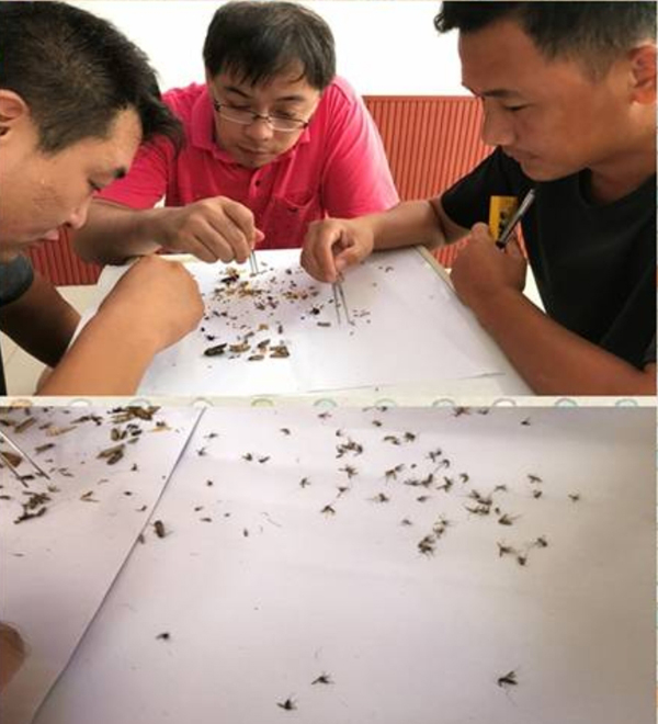 在捕获的一堆虫子中挑出不同种类的蚊子(市疾控中心供图)