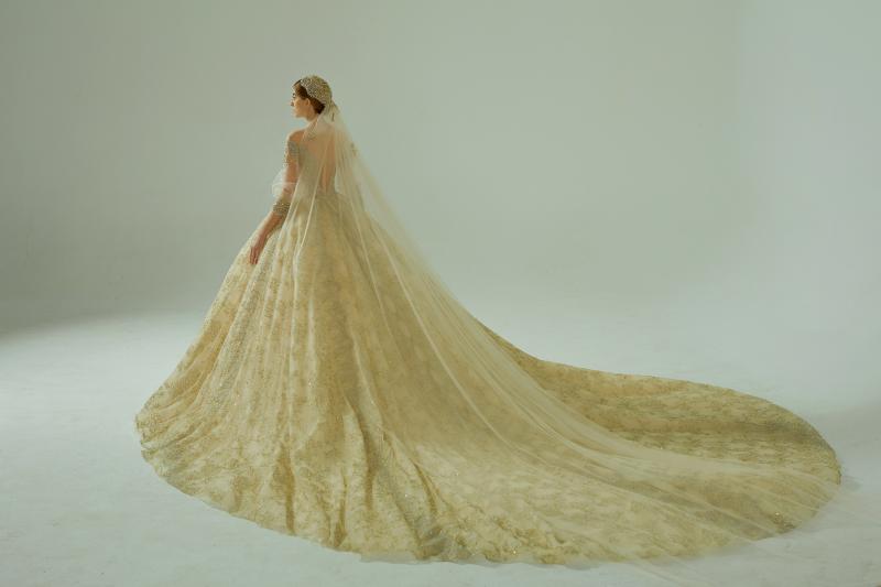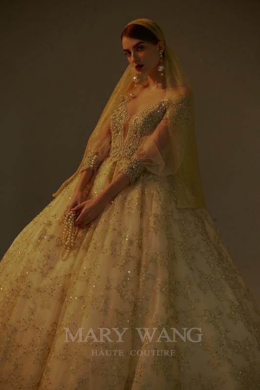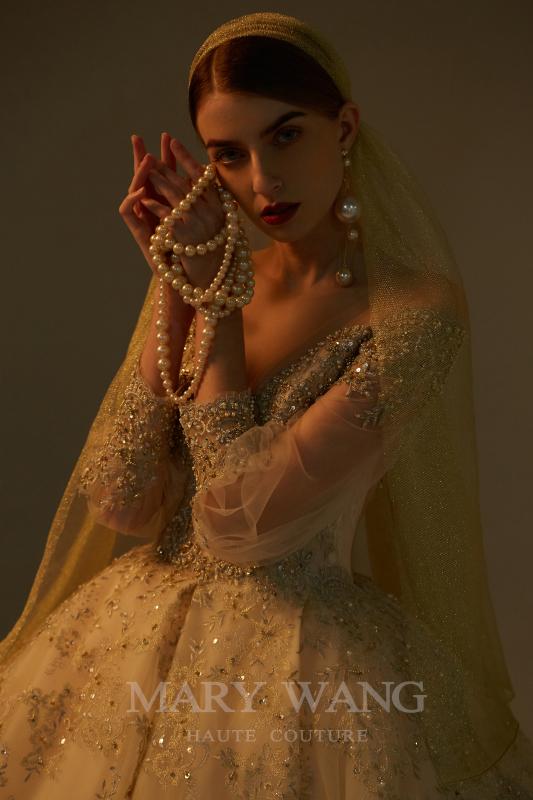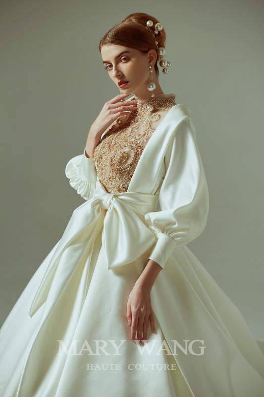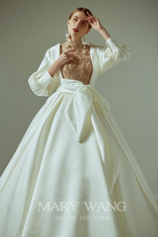 将十七世纪欧洲宫殿的华丽和光影重叠的效果用在了这一季的设计上。采用了具有年代感的金属色来作为整个系列的主题色,亚金色的lace雕花穿插在内外层次上,虚实呼应,营造出华丽的宫廷风。版型上以复古的蓬裙突显宫廷的气派,而立体的块面堆积延续了建筑的线条力量感。细节设计大量使用珍珠、水晶、金银角管和不同尺寸的钻,纯手工细细雕琢,与这一主题完美呼应。将欧洲的古典文化与东方美恰到好处的结合在一起,通透的设计与内敛的高领和长袖结合一体,短而俏的腰节裁剪,将典雅而沉静的东方美释放出奢华、尊贵的王者气息。