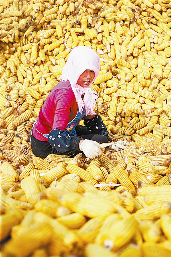 在普兰店一户农家院内,农民自家的玉米已入仓,好似黄金在地上蔓延开来。